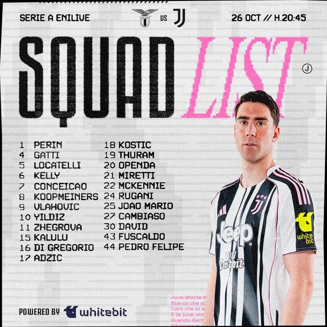 北京时间10月25日,尤文图斯官方公布了意甲第8轮他们做客挑战拉齐奥的大名单,布雷默、卡瓦尔、平索利奥和米利克继续因伤缺阵。